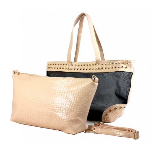 Mesh 2-in-1 Totes w/ Metal Studded Croc Embossed PU Trim - Beige - BG-100845BEI