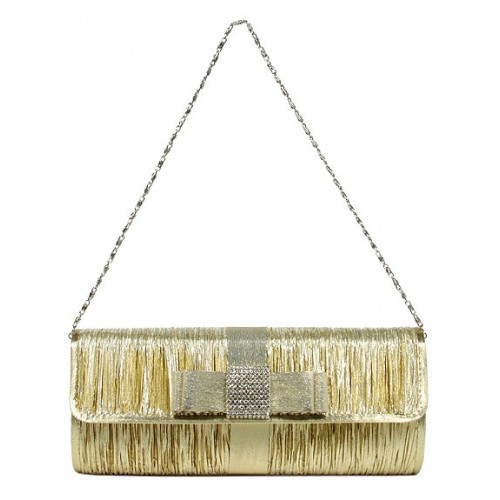 Evening Bag - Pleated Clutch w/ Metal Mesh Accent Bow Flap - Gold