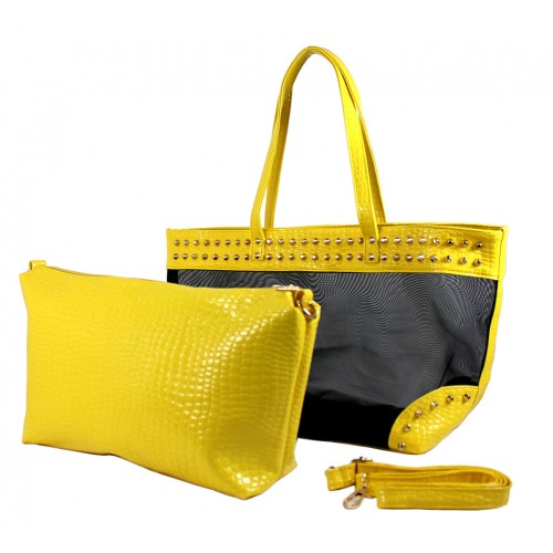 Mesh 2-in-1 Totes w/ Metal Studded Croc Embossed PU Trim - Yellow