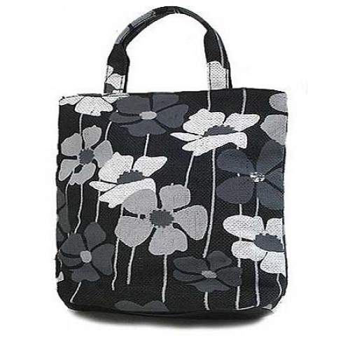 Black - White Floral Print Paper Straw Tote