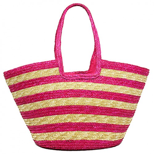 Straw Tote: Striped Woven Wheat Straw Tote - Fuchsia - BG-B11047FU